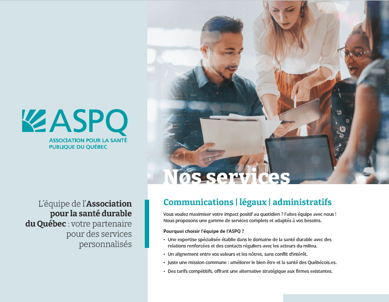 La santé durable pour toutes et pour tous ! L’ASPQ soutient le développement social et économique du Québec par la promotion d’une conception durable de la santé et du bien-être. Cette dernière s’appuie sur une vision à long terme qui, tout en fournissant des soins à l’ensemble de la population, s’assure aussi de la garder en santé par la prévention.